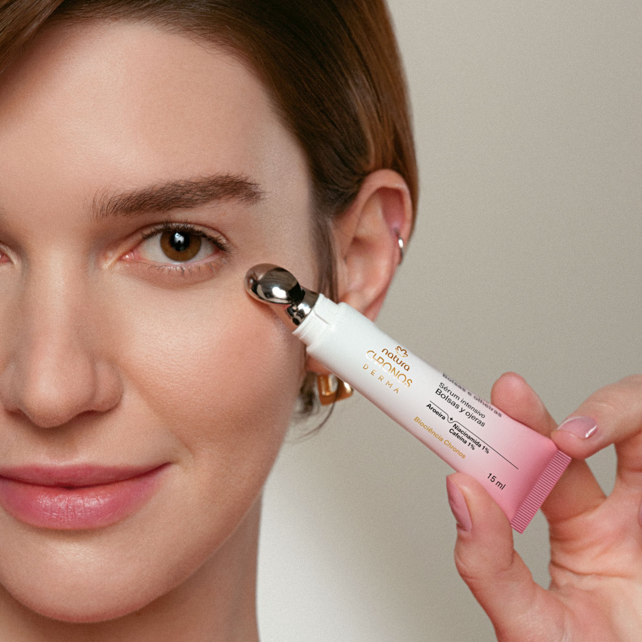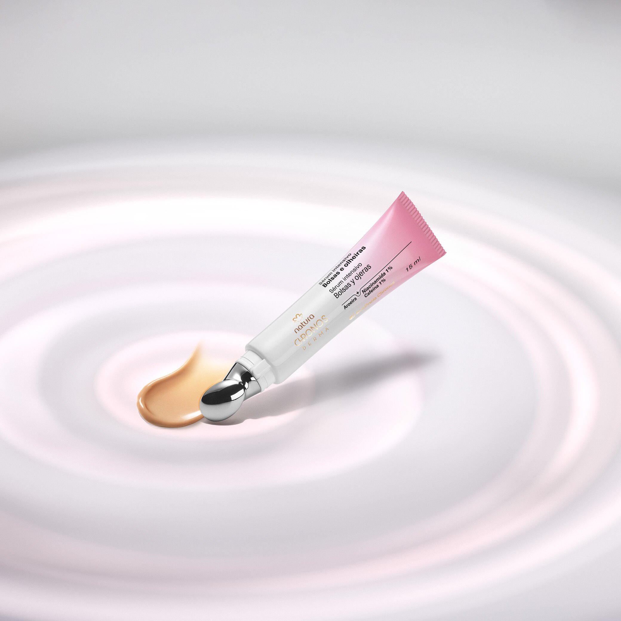 el Sérum Intensivo para Bolsas y Ojeras Natura Chronos Derma posee tecnología exclusiva que une el extracto de aroeira, ingrediente de la biodiversidad brasileña, a la cafeína y a la niacinamida, activos reconocidos por la ciencia mundial.
