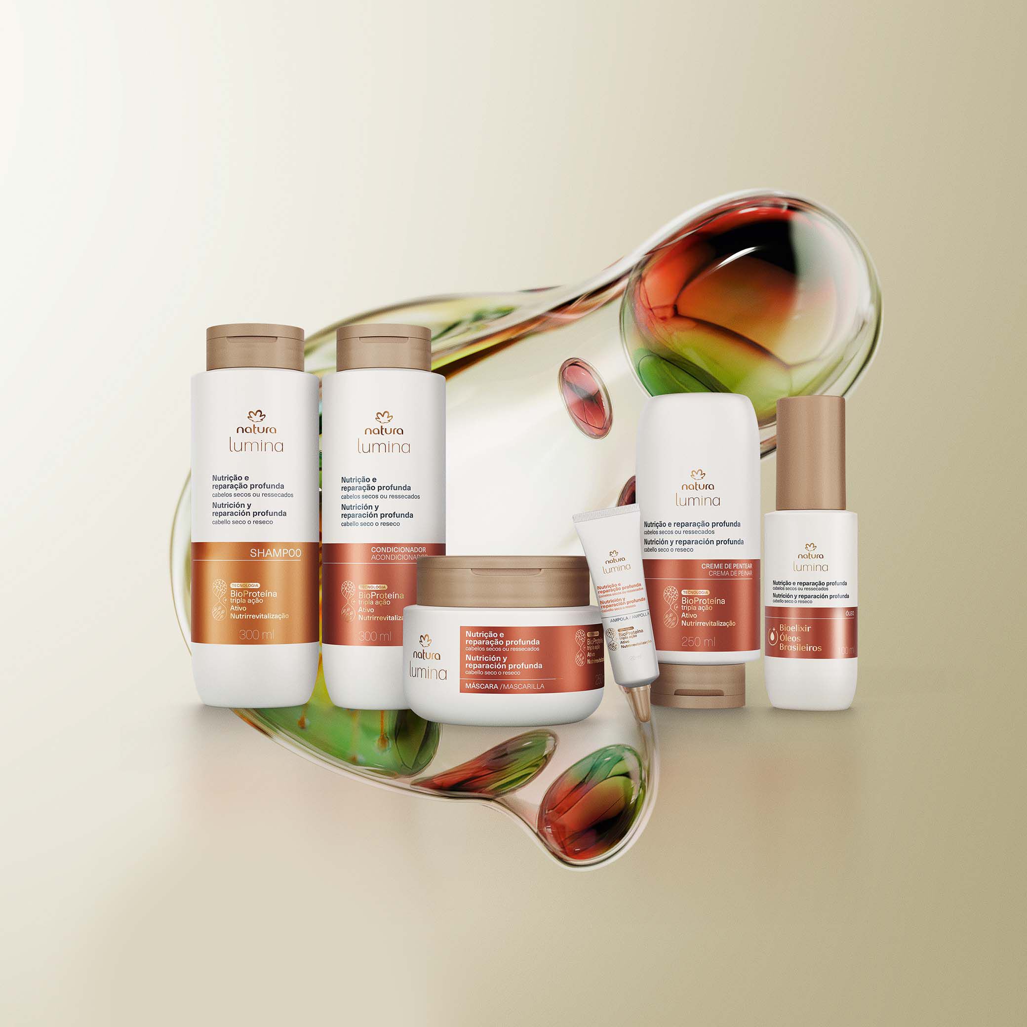 BioProteína de triple acción + activo Nutrirrevitalización: combinación exclusiva de activos que trabajan en el relleno inteligente de daños internos y la reparación externa de la fibra capilar. promueven una recarga profunda de nutrientes esenciales, reparación y fortalecimiento del cabello