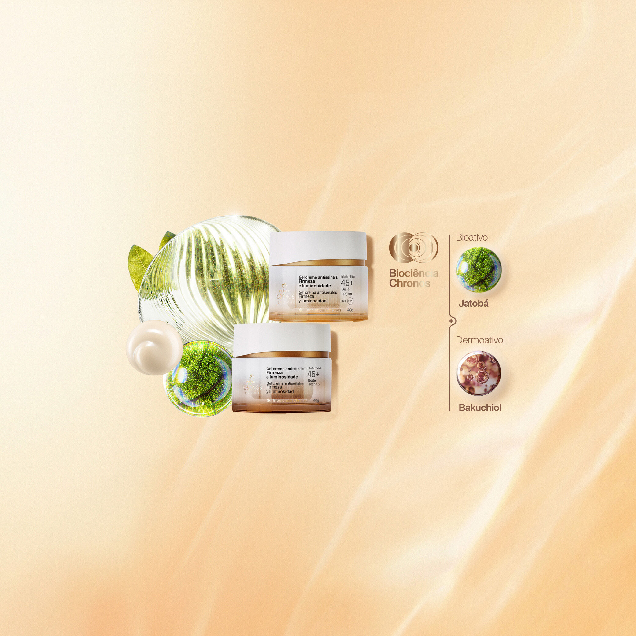 una combinación de potentes bioactivos de la naturaleza y dermoactivos para cuidar tu piel. el bioactivo Jatobá estimula el colágeno natural de la piel, mientras que los dermoactivos Bakuchiol y Niacinamida reducen las arrugas y unifican el tono de la piel..