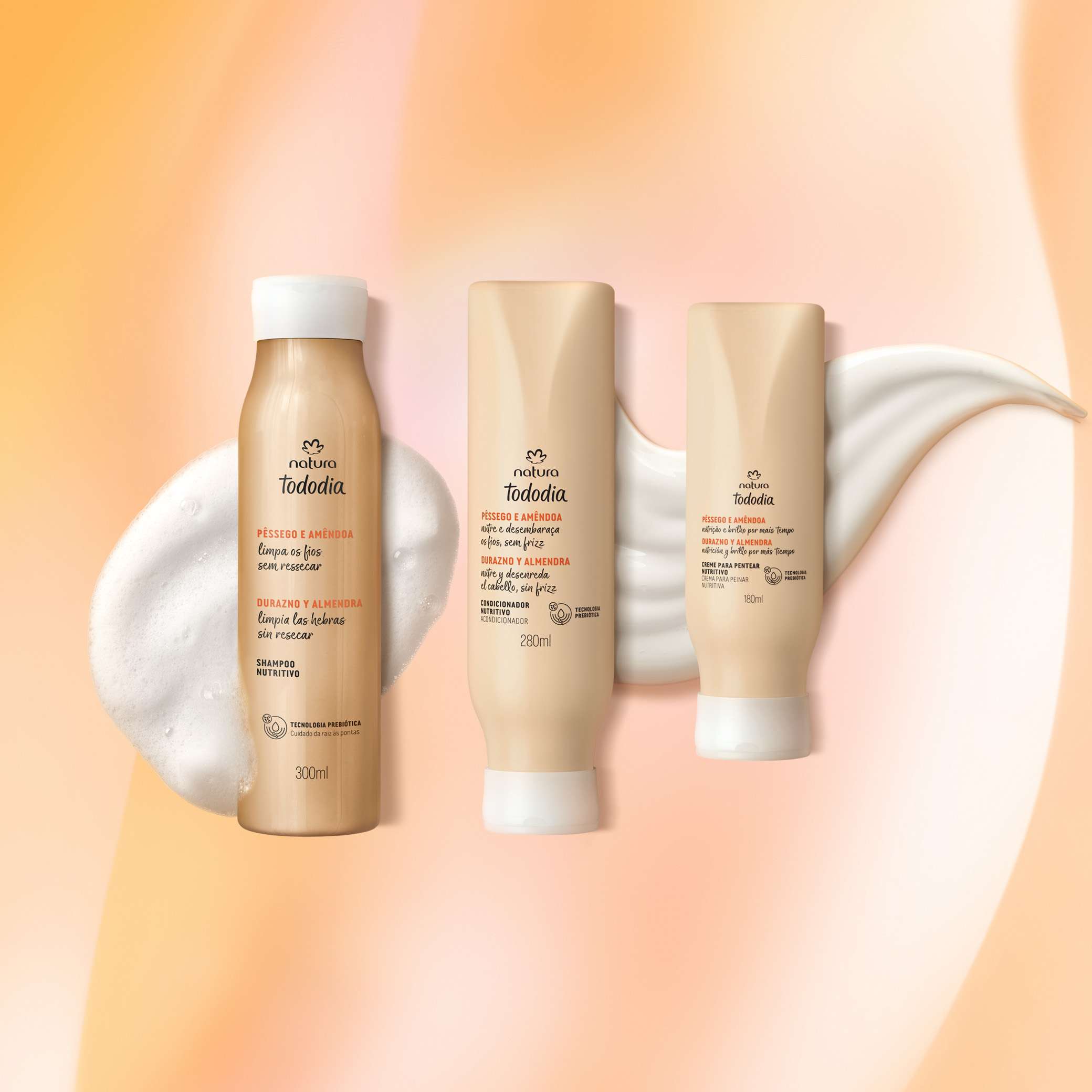 Natura Tododia combina los mejores nutrientes para tu cabello, con prebióticos que protegen y equilibran el cuero cabelludo. todo para que tu cabello luzca más bonito y saludable cada día. la línea con aceite de almendra nutre y devuelve el brillo natural